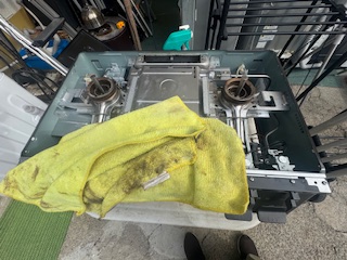 写真のように天板を外し、内部のパーツまでバラバラにして、見えない部分に潜む油汚れや焦げ付きを徹底的に落としています。