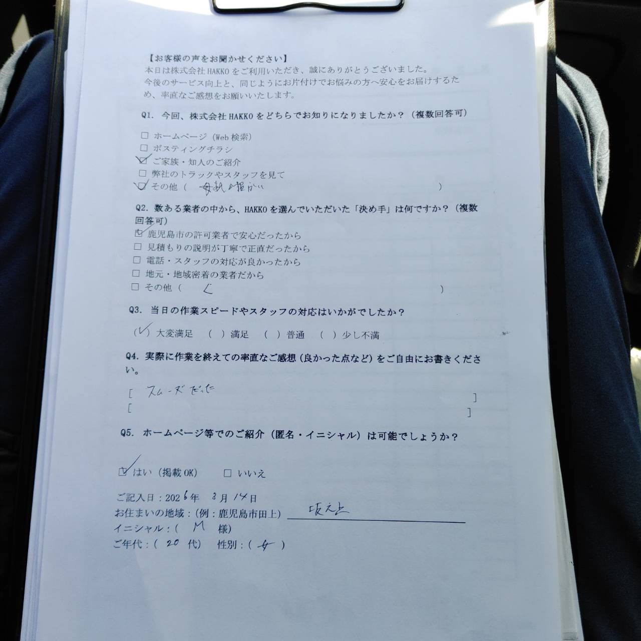 アンケートでは「お母様の紹介」で当店を知り、「鹿児島市の許可業者で安心だったから」という理由でお選びいただいたとのこと。大変光栄です!