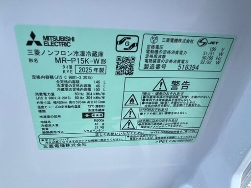 【最速入荷!】2025年製!三菱電機 146L冷蔵庫 MR-P15K-W マットホワイトが驚きの価格で登場!出張買取・販売は八光へ!