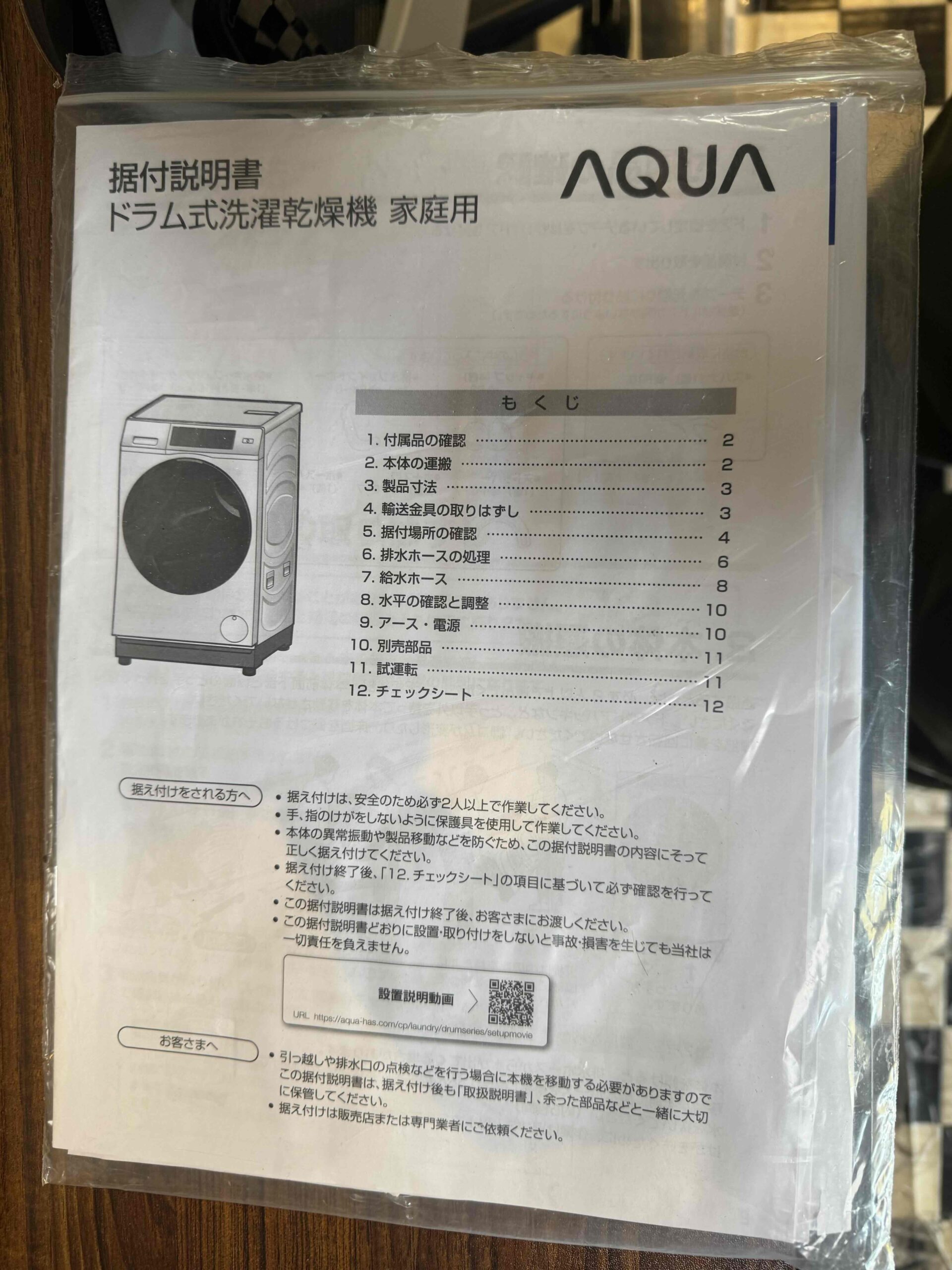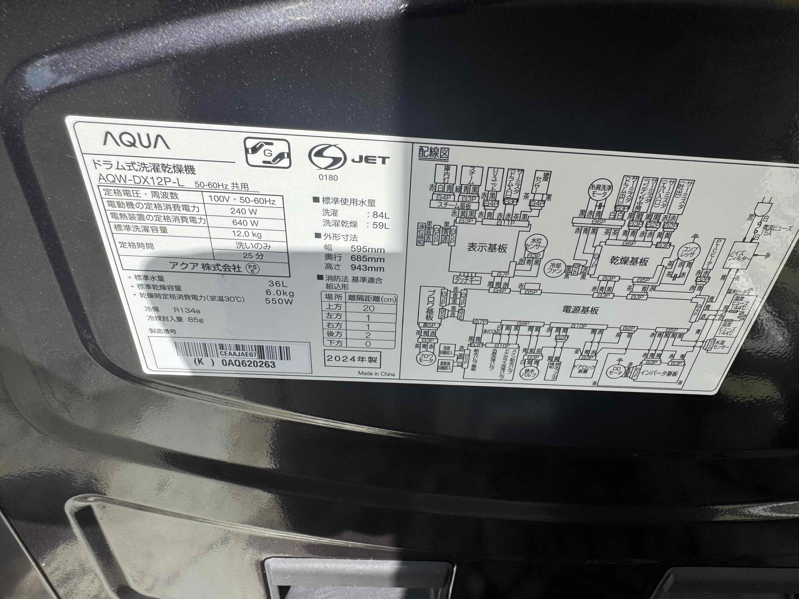 2024年製、AQUA(アクア)のフラッグシップモデル「AQW-DX12P-L」ドラム式洗濯乾燥機です。