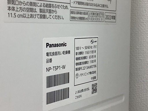 中古家電で最も気になるのが「製造年」ですが、このNP-TSP1-Wは2022年製と非常に新しいモデルです。