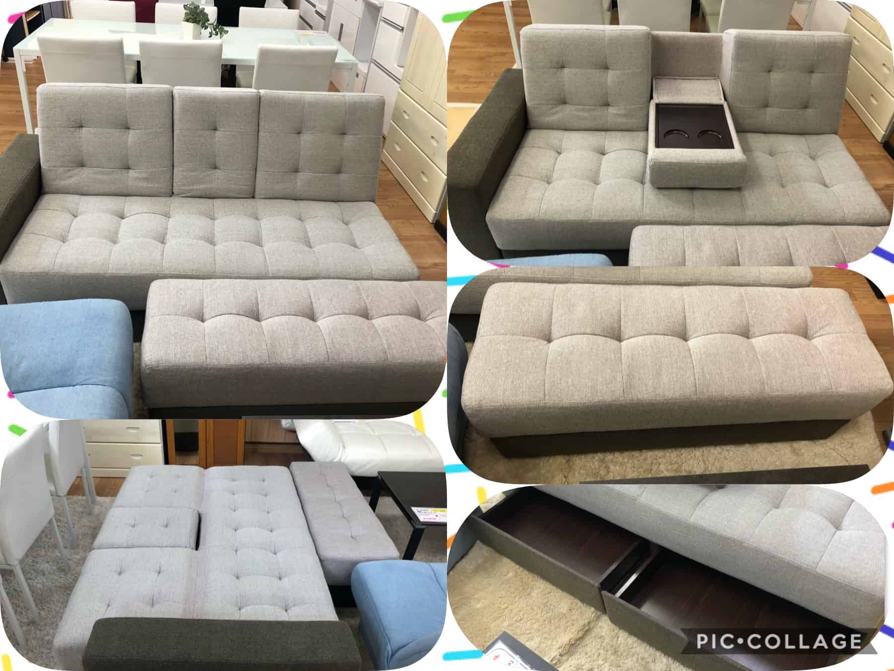 約140cm幅のソファに約35cm幅のスツールをプラスで約175cm幅に。