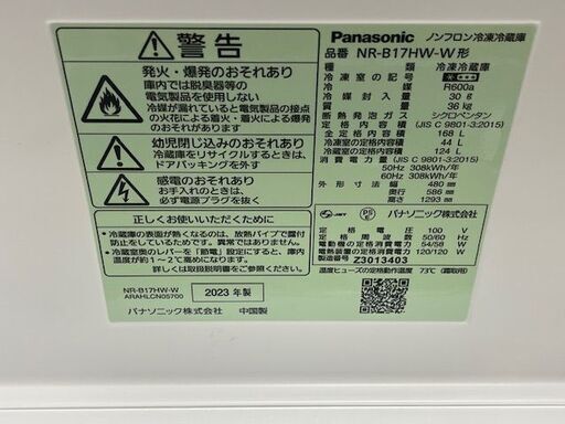 2023年製!Panasonic 2ドア冷蔵庫(NR-B17HW-W)