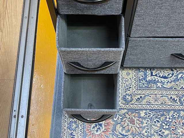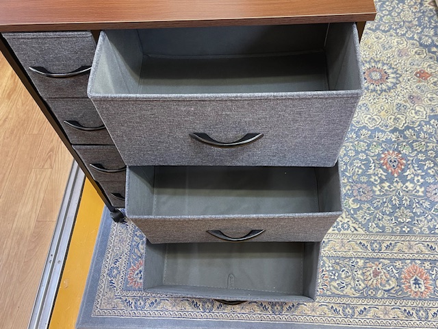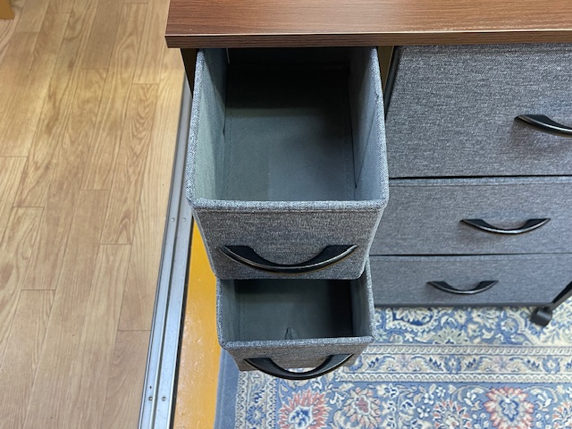 今回入荷したのは、グレーの布製引き出しと、温かみのあるブラウンの木目調天板を組み合わせた7杯チェストです。 最近流行りの北欧モダンやナチュラルインテリアとの相性が抜群。 「プラスチック製の衣装ケースだと生活感が出すぎてしまう…」とお悩みの方に、ぜひおすすめしたい一台です。